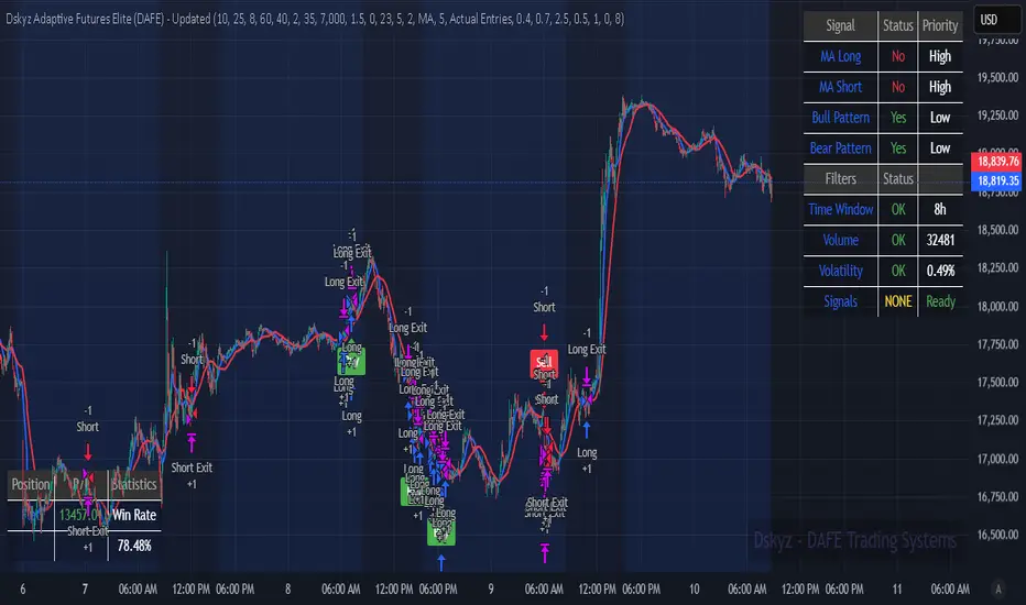 ────────────────────────────── Dskyz Adaptive Futures Edge (DAFE) SummaryDAFE is a dynamic futures trading strategy designed for high-stakes instruments (e.g., MNQ, BTCUSDT.P) that adapts to market volatility and price action with advanced technical indicators and risk controls. It caters to both scalpers and swing traders by offering modular logic and detailed input parameters.