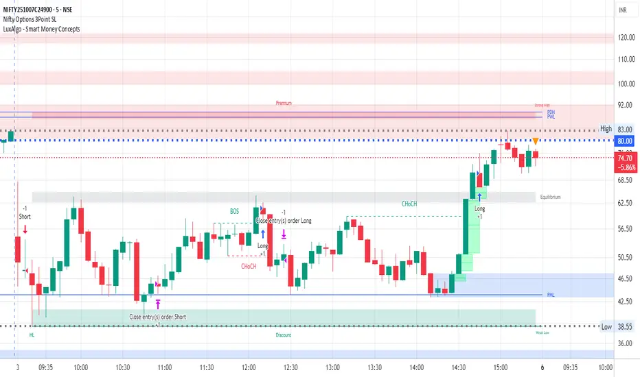 With your settings, the strategy is designed to only take high-probability momentum trades on Nifty Options in the 5-minute chart. The EMA(21) ensures trend alignment; the SQZMOM histogram and angle threshold confirm genuine momentum bursts. Backtest logs typically report moderate trade counts and can provide a solid edge in trending markets, but rapid market reversals can still cause clusters of small stops.