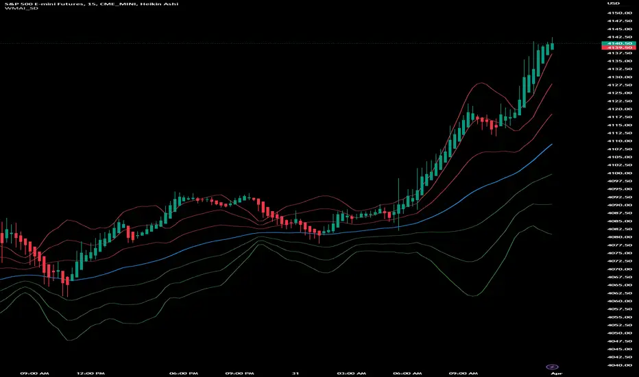 The updated Weighted Moving Average Indicator with Standard Deviation (WMAI_SD) now includes the central line, which is the weighted moving average, along with 3 lines above and 3 lines below the central line that represent different levels of standard deviation. This combination can be used to identify trends, potential entry and exit points, support and resistance levels, and to gauge the volatility of the asset. Here's how to use this updated indicator: