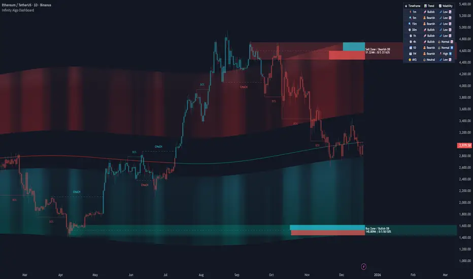 Infinity Algo Dashboard combines 4 powerful modules into one clean overlay: Multi-Timeframe Analysis, Order Blocks, Market Structure (BOS/CHoCH), and Adaptive Cloud Bands.