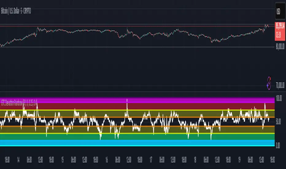 The GTC Deviation Rainbow is a powerful, all-in-one tool designed to pinpoint market extremes, detect mean reversion opportunities, and clarify trends with stunning accuracy. By visualizing multiple deviation bands, it reveals overbought and oversold conditions across all timeframes, giving you the insight you need to make confident, high-probability trades. The GTC Deviation Rainbow combines volatility analysis, mean reversion detection, and market trend clarity—all in one cutting-edge package.