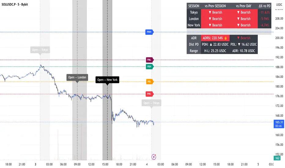 - A unified ADR panel directly under the session table with real-time extension signaling and distance-to-PDH/PDL — pragmatic, trade-ready context you won’t find in generic session scripts.