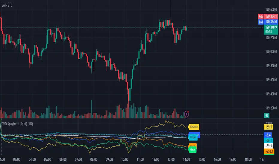 The CVD Spaghetti – Multi-Exchange (Spot) indicator provides a consolidated view of Cumulative Volume Delta (CVD) across multiple spot exchanges in a single chart. By plotting exchange-specific CVD lines simultaneously, it allows traders to track differences in buy/sell pressure between venues and gain a broader perspective on market flows.