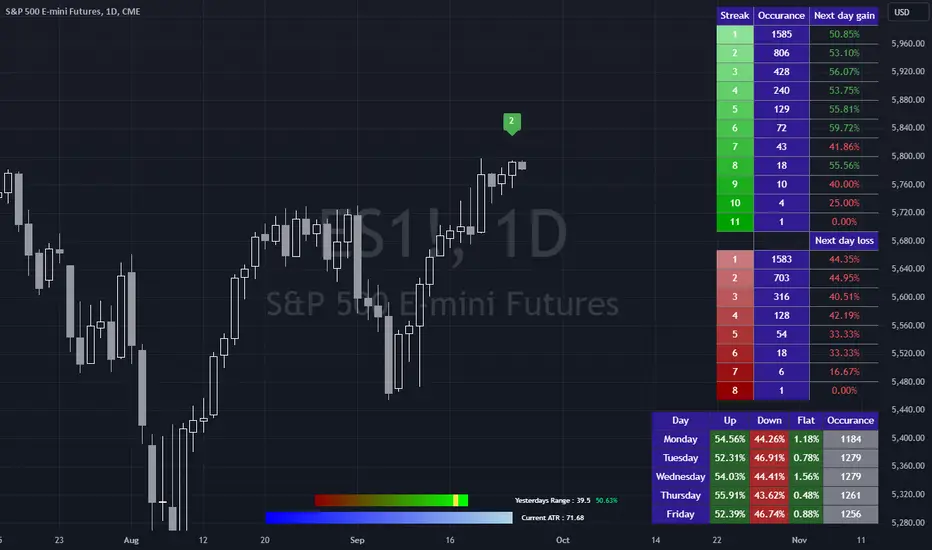 Once that is determined, the close is classified into which quartile of the range it closed in. This means there are 8 different groups of closes. Once a close has been grouped, it is compared with all the other closes of the same group to return the historical change of the next day. So for example, a day might have a range inside the current ATR and have closed in the 3rd quartile of the range. From this we can determine the historical percentage of days that were up days after such a close.