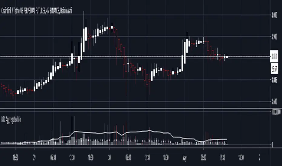BTC Aggregated Volume merges all major crypto exchange volume and overlays it onto any asset. Select from different scales (true, xlarge, large, medium, low, very low) BTC to best fit the liquidity of the current charts asset. Aggregated chart is Histogram and current asset charts volume is transparent column. Useful for alts to clearly see BTC volume spikes on laging correlated coins, or whether or not the spike on the alts coin will follow through (if diverging from BTC volume).