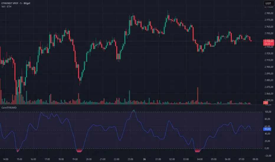 CoreTFRSIMD is a Pine Script v6 library that implements a TFRSI-style oscillator core and exposes it as a reusable exported function. It is designed for authors who want the same TFRSI calculation across multiple indicators or strategies without duplicating logic. The library includes a simple demo plot and band styling so you can visually sanity-check the output. No higher-timeframe sampling is used, and there are no loops or arrays, so runtime cost is minimal for typical chart usage.