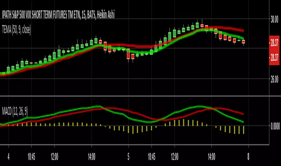 Uses TEMA indicator and 9 EMA together as 1 script.