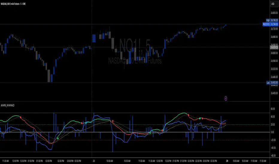 The "Anchored Volume-Weighted RSI & Multi-Normalized MACD" is a sophisticated Pine Script v6 indicator designed for TradingView. It combines an Anchored Volume-Weighted Relative Strength Index (VW-RSI) with a Multi-Normalized Moving Average Convergence Divergence (MACD) to provide traders with enhanced market analysis tools. This indicator allows for customizable anchoring, multiple normalization techniques, and stepped visualization for precise trend and momentum analysis.