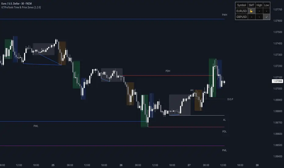 This indicator helps traders apply these principles by merging time-based and price-based analysis tools for better market understanding. By combining high-impact sessions like Kill Zones with pivotal price markers such as Previous Highs and Lows, traders can see where institutional activity intersects with liquidity pools, improving their decision-making.