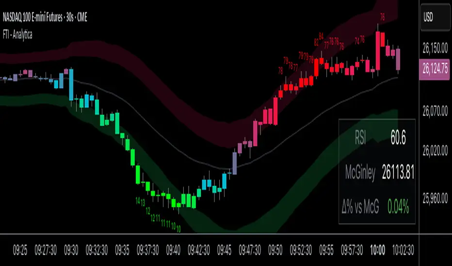 In Analytica, you can view the exact McGinley value and Δ % distance from price, providing a real-time sense of stretch or compression.