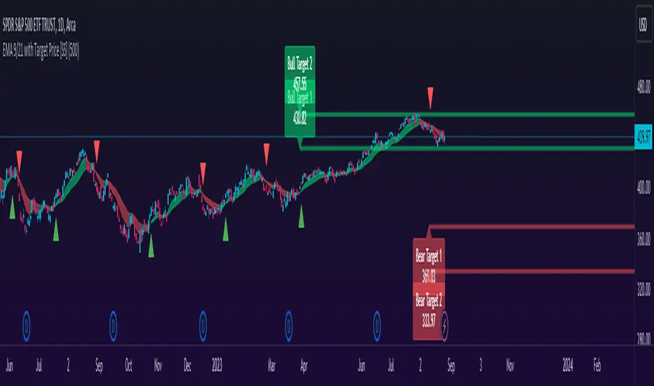 Essentially, it just combines the 2 only EMA's I ever really use (the 9 and 21) with an ATR based analysis to calculate the average range a ticker undergoes after an EMA 9 / 21 Cross-over and Cross-under.