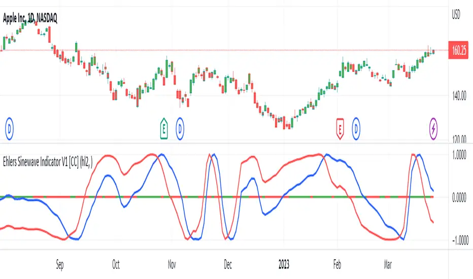 The Sinewave Indicator was created by John Ehlers (Rocket Science For Traders pgs 97-99) and this is a few indicators in one. Simply put it is a leading indicator which you don't see too many of those these days. If the blue line crosses over the red line then within the next few bars the price will start an uptrend and if the blue line crosses below the red line then in the next few bars it will start a downtrend. I have also included an immediate buy and sell signal on the 0 line which is green when you should buy and red when you should sell.