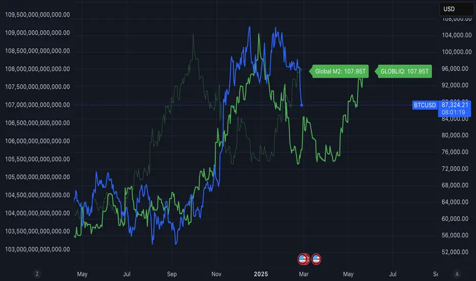 This indicator tracks global liquidity by aggregating M2 money supply data from major economies around the world, denominated in US dollars. It allows users to shift the data forward or backward in time to analyze correlations with other assets, particularly Bitcoin.