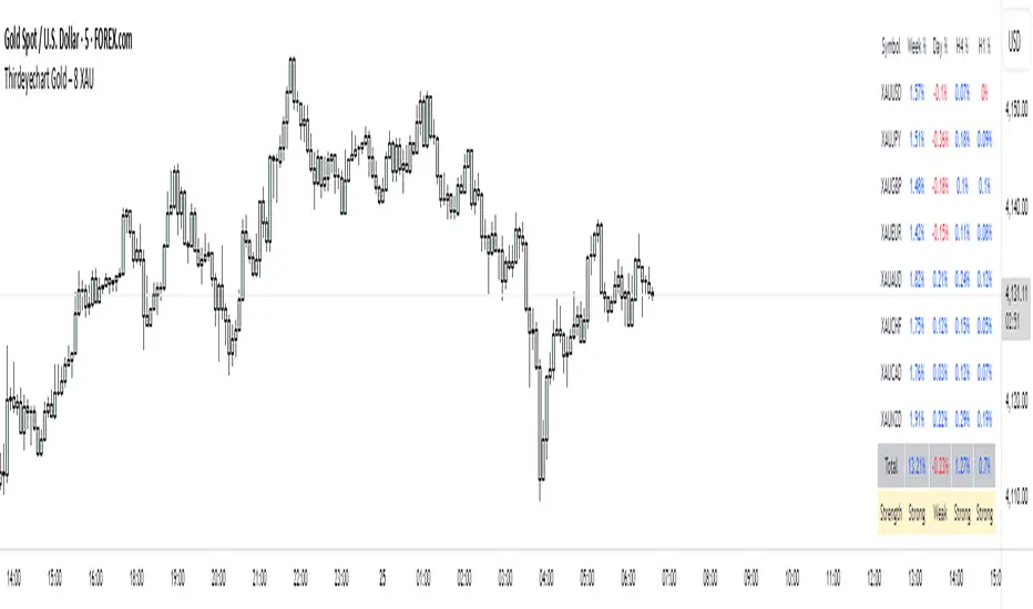 This version includes percentage change calculations for Weekly (W), Daily (D), 4-Hour (H4), and 1-Hour (H1) timeframes for all eight gold-related pairs you insert. Positive values appear in blue, negative in red. The upgraded layout is optimized to remain clean, compact, and readable even with eight gold symbols displayed.