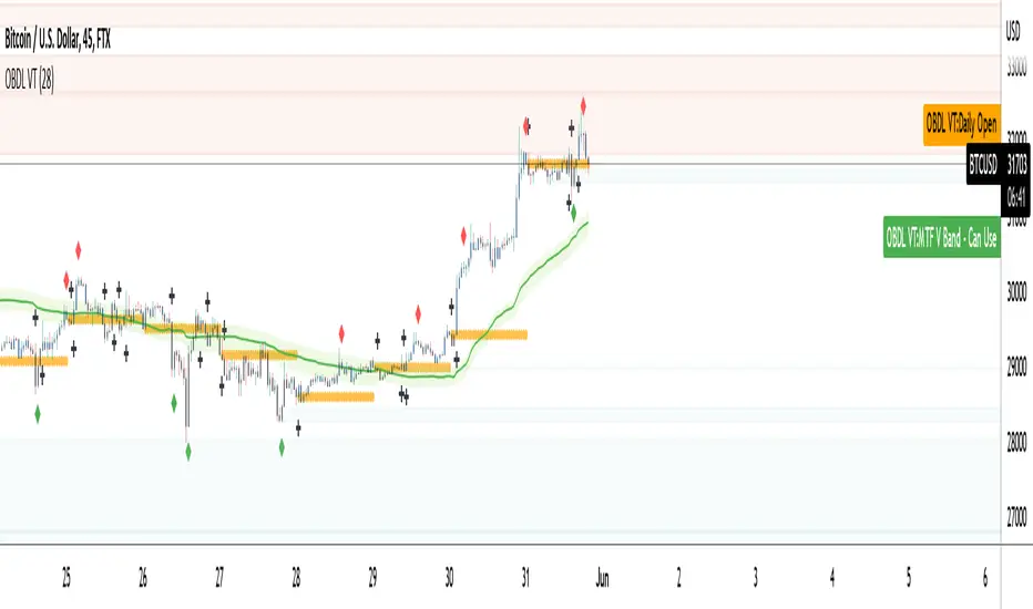 There is also a high time frame volume average line to combine the green volume weighted band to identify a bullish or bearish trend.