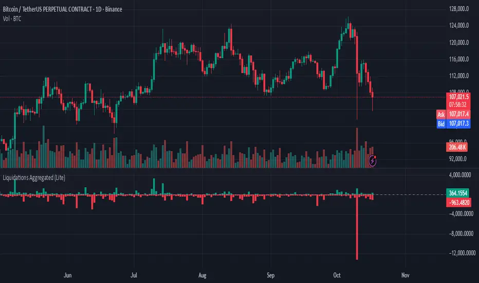The Liquidations Aggregated (Lite) script provides a unified cross-exchange visualization of short and long liquidation volumes, allowing traders to identify high-impact market events and sentiment reversals driven by forced position closures. It aggregates normalized liquidation data from Binance, Bybit, and OKX into a single coherent output, offering a consolidated perspective of derivative market stress across major venues.