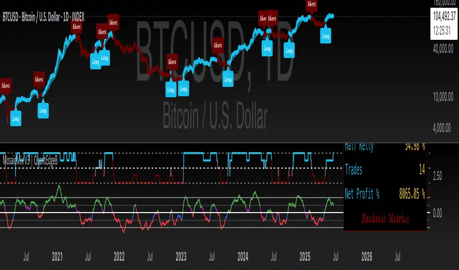 MosaicMix V3 is a powerful fundamental trend-following system that merges on-chain analysis, macroeconomic insights, and technical momentum into a comprehensive risk-adjusted model. It is particularly well-suited and optimized for Bitcoin and macro-aware traders, but can also be applied to other assets with sufficient historical data.