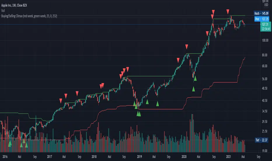 Dieser Indikator ist für den Aktienmarkt ausgelegt und markiert potenzielle Kauf-/ bzw. Verkaufs-Höhepunkte. Wird ein „Buying-Climax“ bzw. „Selling-Climax“ markiert, ist die Wahrscheinlichkeit hoch, dass dieses Preisniveau nicht so schnell überschritten bzw. unterschritten wird. Der Indikator wird ausschließlich auf der wöchentlichen Zeitebene eingesetzt.