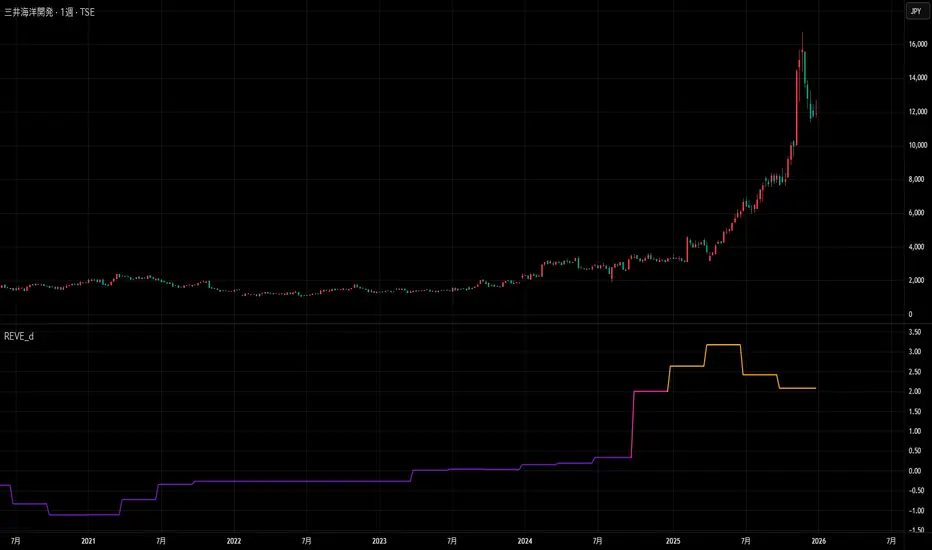 The usage of REVE is extremely simple. Display a stock price chart on a daily timeframe or higher, and show the REVE indicator at the same time.