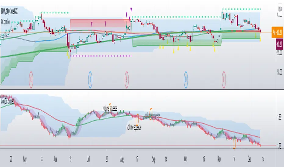 I added Bollinger band to analyze Accumulation/Distribution for volume squeeze, in addition to channel, moving averages, and Elder Impulse for analyses of this Acc/Dist.Скрипт с защищённым кодом