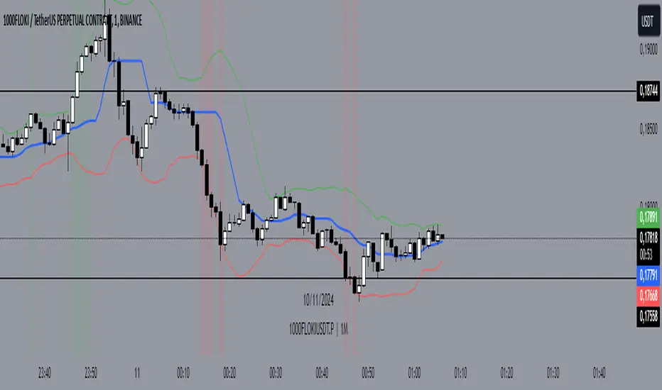 3. Области на графике: Индикатор выделяет фон, когда цена находится выше верхней границы (область окрашивается в зелёный) или ниже нижней границы (область окрашивается в красный). Эти визуальные подсказки могут помочь трейдерам быстро выявить отклонения.