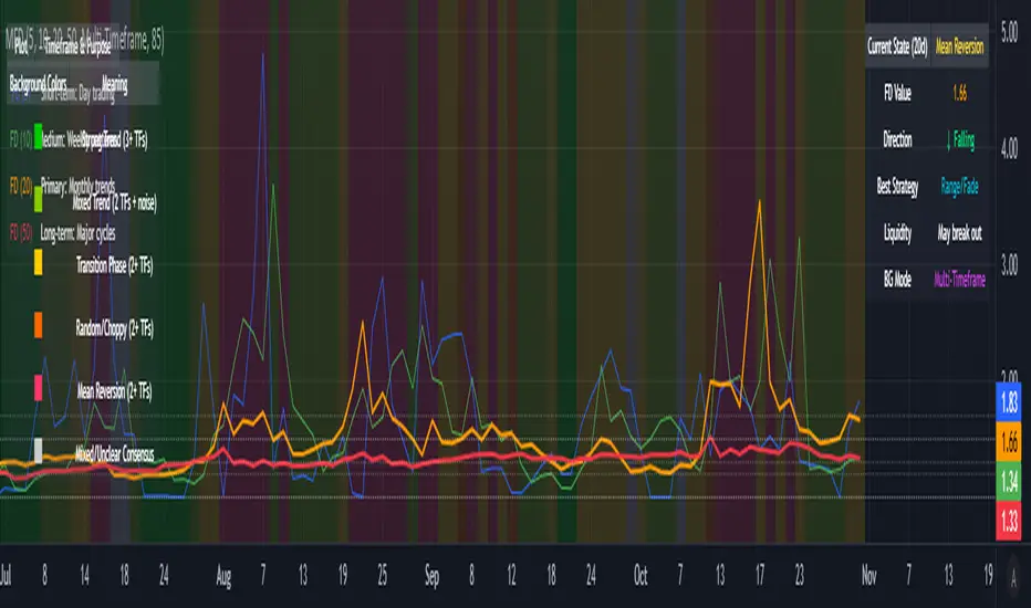 The Mandelbrot Fractal Dimension (D) measures the information density and path complexity of price movements. It quantifies how much a price path fills the space between its starting and ending points: