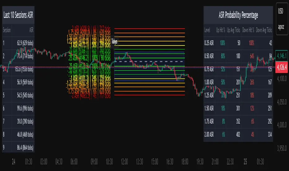 The Average Daily Session Range PRO (ADSR PRO) is a professional-grade analytical tool designed to quantify and visualize the probabilistic range behavior of intraday sessions.