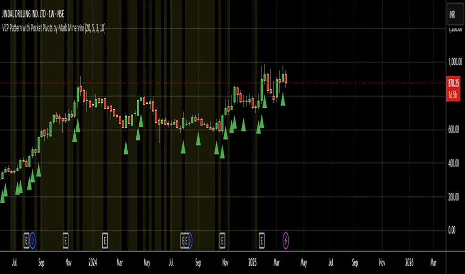 Below is a Pine Script designed to identify and plot Mark Minervini's Volatility Contraction Pattern (VCP) along with Pocket Pivots on TradingView. The VCP is characterized by a series of price contractions (tightening price ranges) with decreasing volume, often followed by a breakout. Pocket Pivots, a concept from Chris Kacher and Gil Morales, identify early buying opportunities within a consolidation or uptrend based on volume surges. This script combines both concepts to help traders spot potential setups.