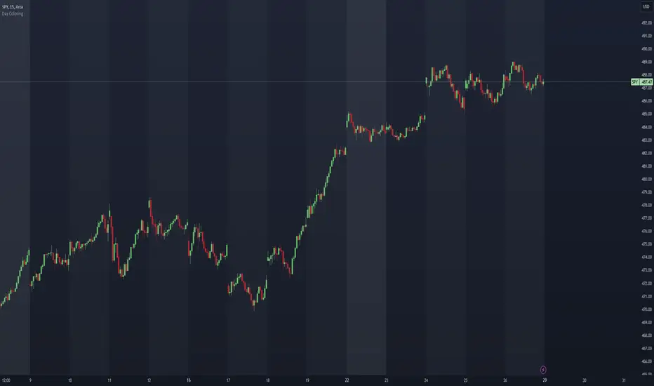Day Coloring Indicator, A tool designed to bring visual clarity to your charts by dynamically coloring the background based on the day of the week. This script adds a layer of organization to your charts, making it easier for traders to track and analyze market movements on different weekdays.