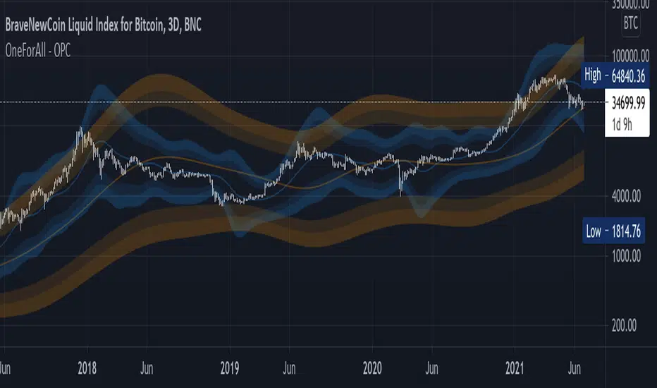 I have found most conventional channels to be either not based on "proper" volatility (e.g. standard deviation of price action for Bollinger Band), or the bottom channel to be ill adapted to the logarithmic scale and plunges to 0 on some high volatility periods, messing with readability on logarithmic auto-scaled chart.
