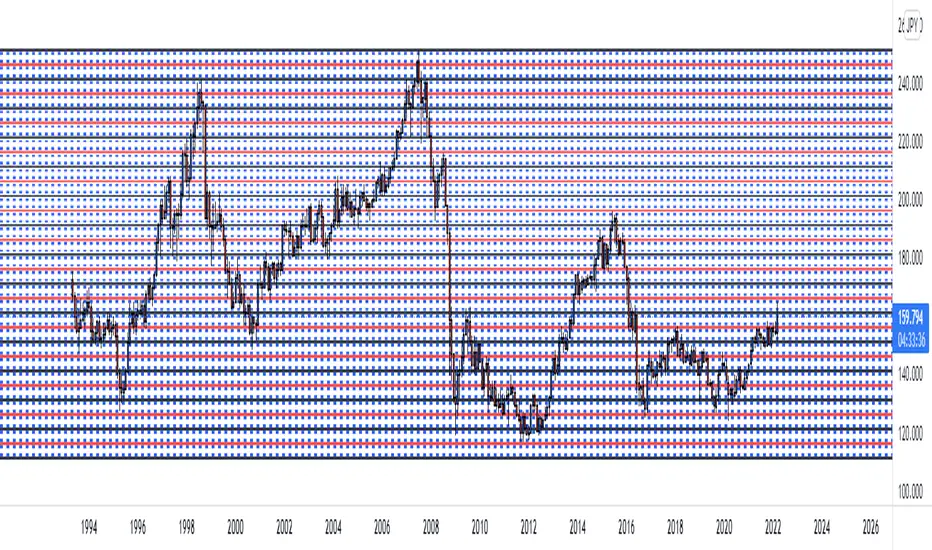 This indicator identifies the historical high and plots bank levels against it. The black lines are 1000 pips apart, the red line is in the middle, and the blue dotted lines are 118 pips away from the black and red lines.