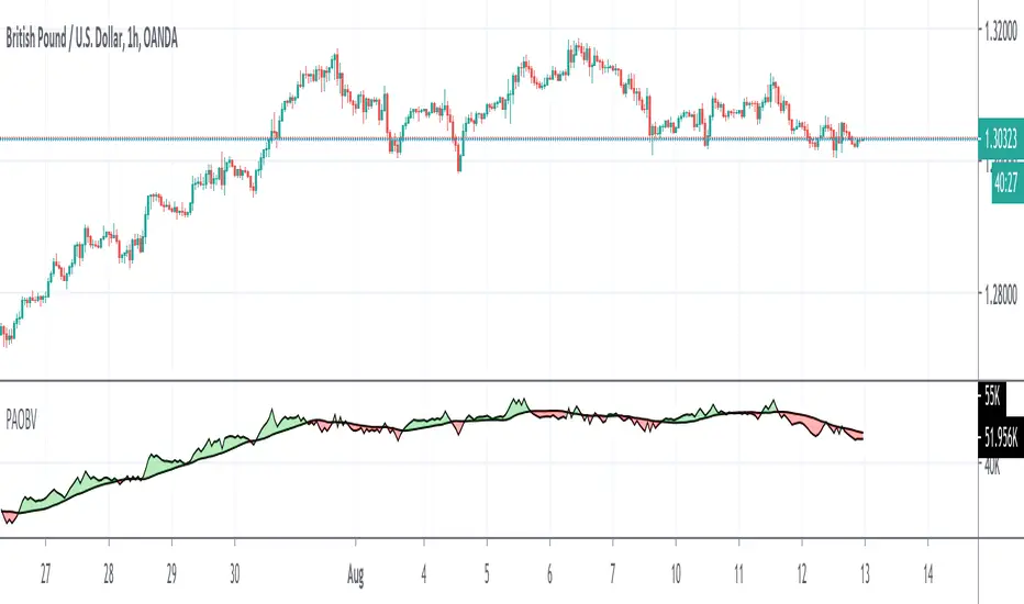 - Long trade: Upward sloping signal line and OBV greater than the signal line (shaded green).