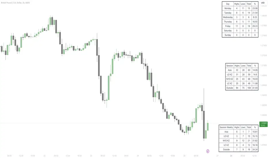 For the default settings (which contains the ICT Asian range and Kill zones), it's best used in 1-hour chart. If you're modifying the sessions, then make sure you use it on a timeframe which can fit all the enabled sessions. For example, if one of your sessions is 2-hour, but you're switching to a 4-hour chart, then the stats will contain errors and isn't reliable.