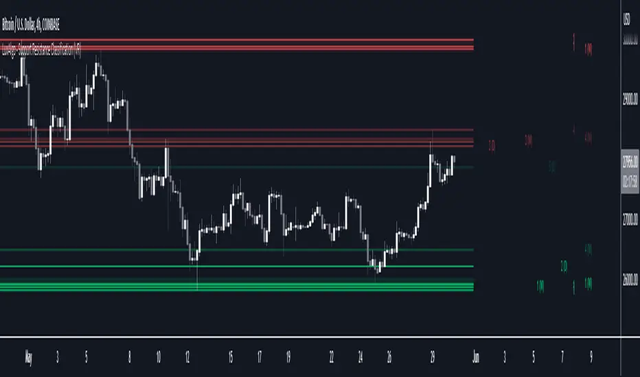 The Support Resistance Classification (VR) indicator shows SR levels on any chart's visible range using higher time-frame data (HTF). Levels are classified 1 through 10 based on their strength, with lower values indicating stronger support/resistance levels.