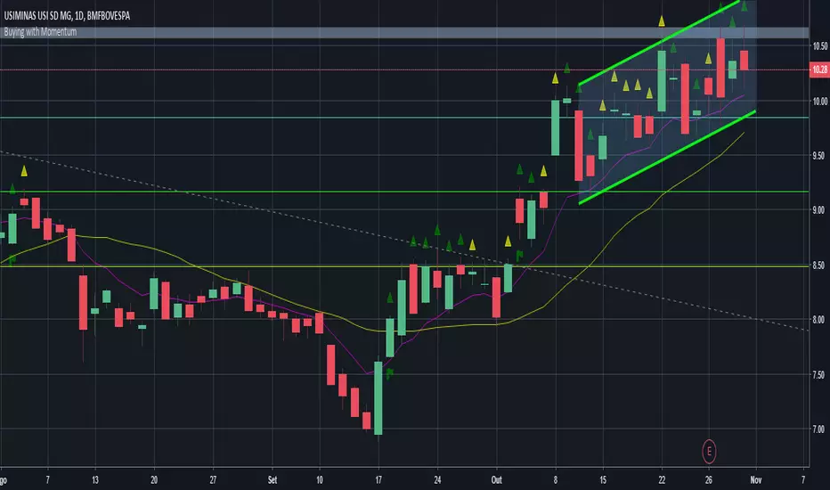 Yellow Arrows --> When the EMA of 9 candles and the MA of 21 candles are higher then the previous candle.