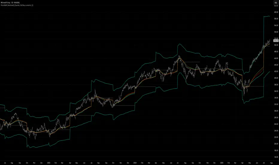 PrismWAP plots three anchored weighted-average prices (VWAP, TWAP, TrueWAP) with dynamic volatility bands and a resettable anchor line. It helps you see key value levels since your chosen anchor period and gauge price excursions relative to volatility.