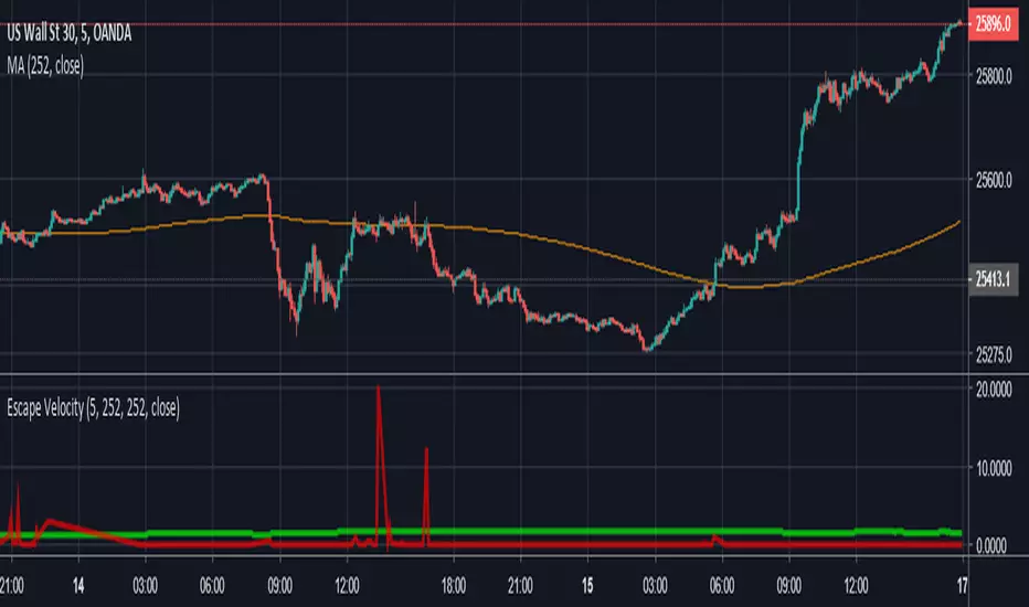 The Escape Velocity is in red and the velocity of price is in green. When price velocity (green) is positive and greater and than escape velocity (red) and price is above the mean, this would indicate that price is breaking away from the mean (bullish). When price velocity is negative and less than escape velocity and price is below the mean, this would indicate that price is breaking away from the mean (bearish).