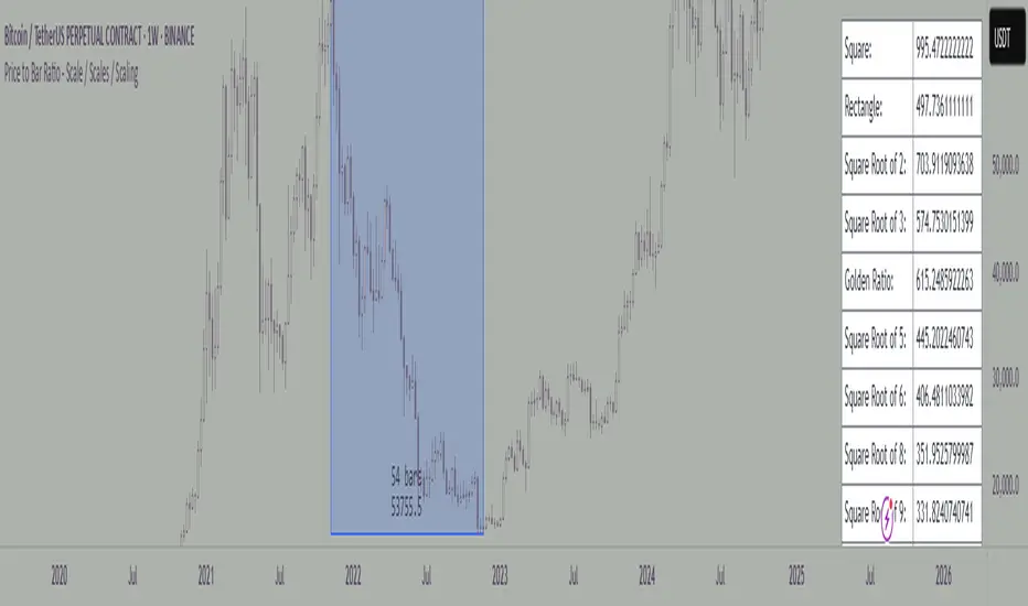 The Price to Bar Ratio - Scaling indicator for TradingView is designed for traders who utilize Gann-based techniques, Michael Jenkins methodologies, or geometric market analysis. It calculates the relationship between price movement and time (bars), providing a bar-to-price ratio that traders can use to align their charts with structured scaling methods.