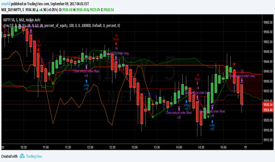 Moving average convergence divergence (MaCD) is a trend-following momentum indicator that shows the relationship between two moving averages of prices. The MaCD is calculated in this strategy by subtracting the 24-day exponential moving average (EMA) from the 12-day EMA. A nine-day EMA of the MACD, called the "signal line", aMaCD in this case, is then plotted on top of the MaCD. In this strategy, MaCD/ aMaCD Cross is functioning as a trigger for buy and sell signals.