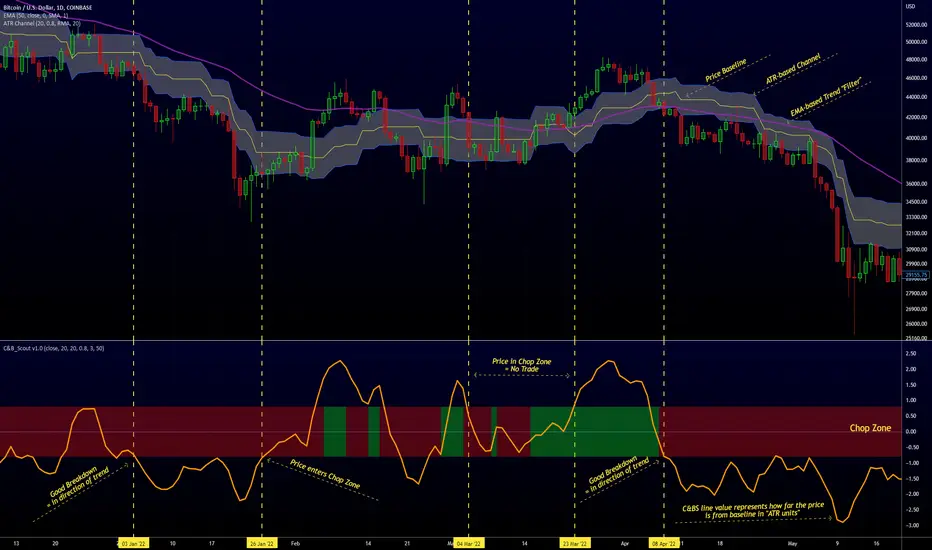 - The C&B Scout line simply calculates how far the price is above/below the baseline in terms of "ATR units". and shows how that value compares to our own definition of a "chop zone"