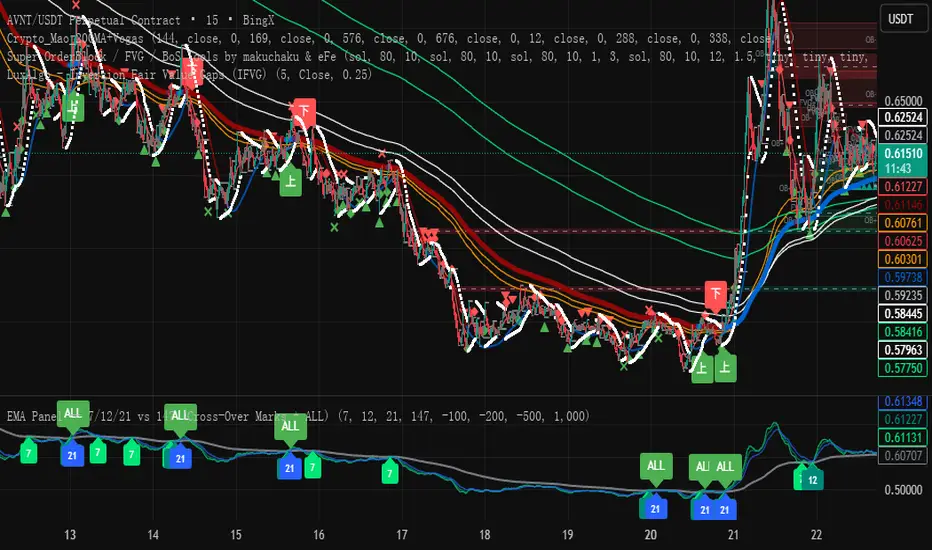The EMA Subpanel — Cross-Over Tracker (7/12/21 vs 147) is designed to visualize multi-layer EMA dynamics in a dedicated subwindow, separating it from price candles.
