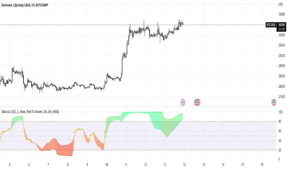 The oscillator uses an adaptive moving average as input to another RSI oscillator and is designed to provide a way to minimize the impact of corrections on the output of the oscillator without significant lag.