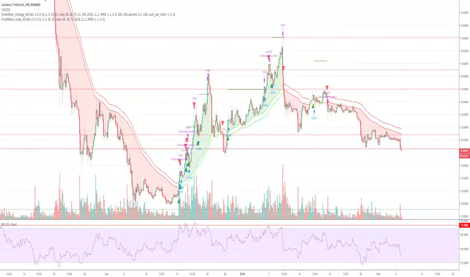 This strategy is based on EMA Ribbon and uses multiple indicators to find optimal time to enter/exit the trade and filter out false signals. The script with default setting is developed mainly for trading altcoins/stable coin pair such as ADA(USDT etc on 4h timeframe but it can be applied to any pair/any timeframe with some settings adjustments.