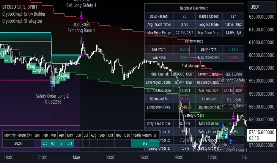 This indicator allows you to use buy & sell signals from external CryptoGraph indicators, and fully backtest these signals in the TradingView strategy tester. After configuring buy & sell signals, the trader can look into exit criteria with this indicator. The indicator offers percentage based an ATR based take profit/stop losses, as well as safety orders (DCA) in order to get a better average entry price.