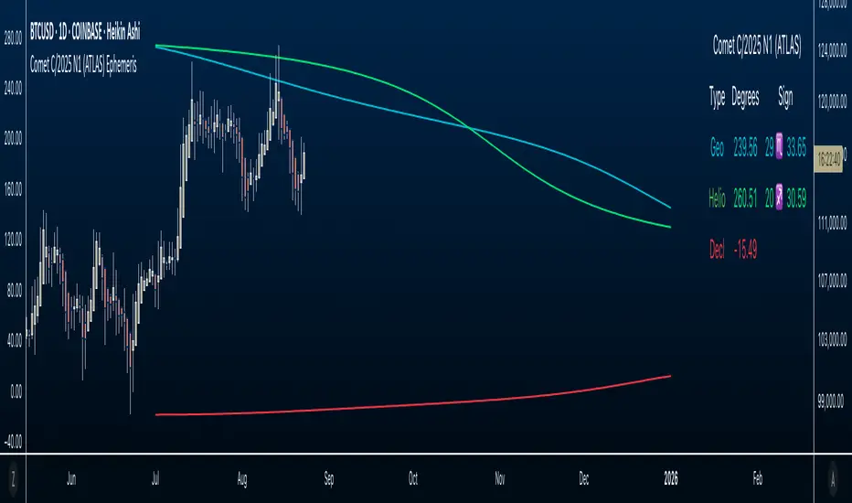 This open-source Pine Script™ v6 indicator demonstrates how to bring external astronomical ephemeris into TradingView and plot it on a daily chart. Using Comet C/2025 N1 (ATLAS) as an example dataset, it shows the mechanics of structuring arrays, indexing by date, and drawing past and forward (future projections) values—strictly as an educational visualization of celestial motion.