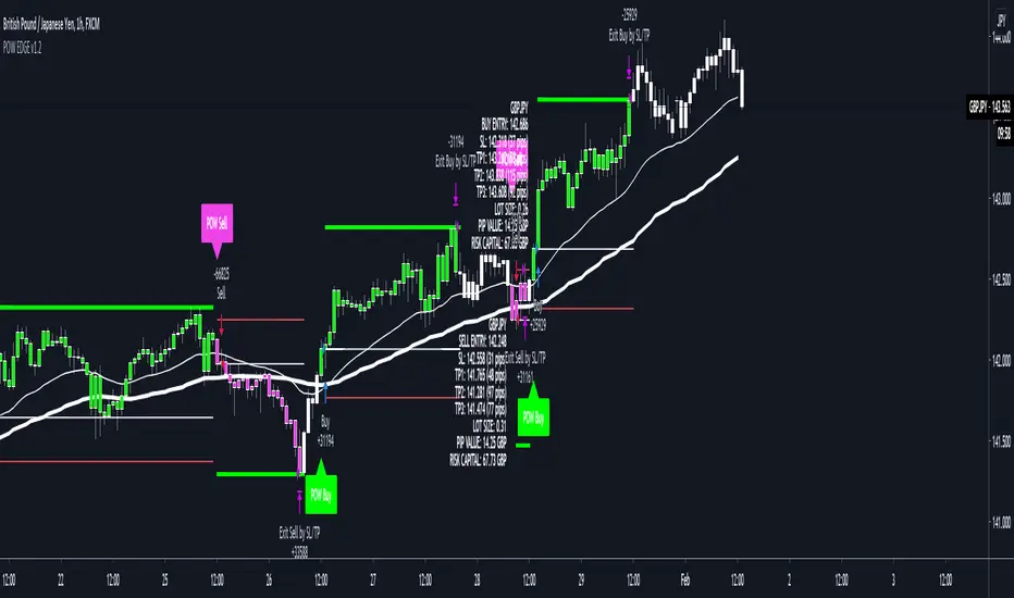 When a new signal is valid, 'POW BUY' or 'POW SELL' will be displayed on the first candle open for entry. As well as this, you will also have the trade label print which will display the following;