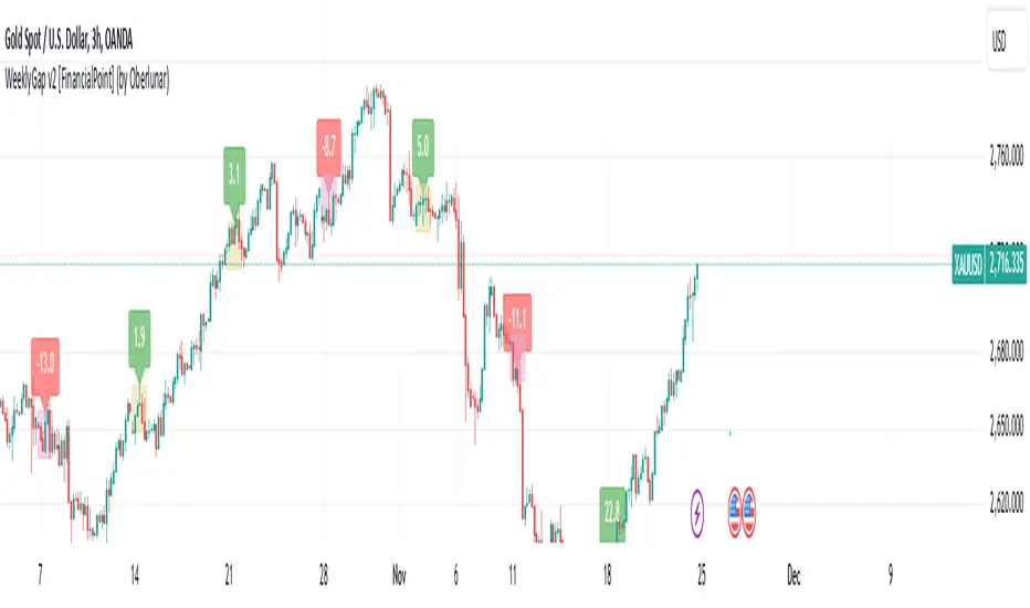 The script "WeeklyGap v2 [FinancialPoint] (by Oberlunar)" calculates and visualizes the weekly price gap between Friday's close and Monday's open. It displays the gap size with dynamic labels and visual circles, color-coded and scaled based on the gap magnitude. Key Monday prices, such as the first open and last close, are tracked and displayed.Minor bugs have been fixed for improved accuracy and performance.