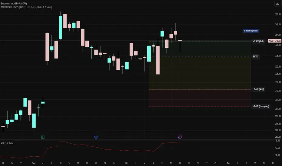 It automatically plots your key decision levels from a defined entry price and ATR value — helping you clearly see when to roll, hold, or exit a trade.