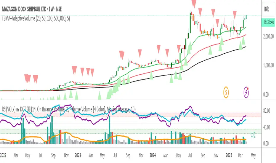 This script merges three exponential moving averages (EMA) with adaptive volume thresholds to identify high-confidence trends. Unlike basic volume indicators, it triggers signals only when volume exceeds both a user-defined absolute value (e.g., 500k) and a percentage increase (e.g., 5%) – reducing noise in volatile markets.