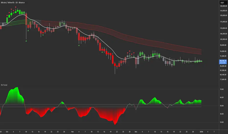 Price Action Trend measures trend *strength* by modelling where price sits inside a smoothed price-action channel, then applying RSI to that “channel position”. It doesn’t predict, but shows what price is doing now.